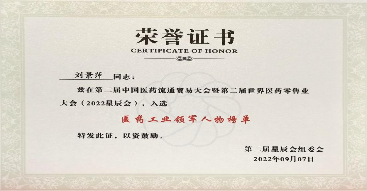 在本次开幕式上,发布了“医药工业领军人物”、“医药零售领军人物”榜单,尊龙凯时药业集团刘景萍董事长凭借在儿药领域多年的努力探索和对行业的杰出贡献,荣获“医药工业领军人物”称号。